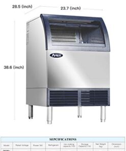 Details: Ice Maker with Bin, cube-style, air-cooled, self-contained condenser, 23.7″W x 28.5″D x 38.6″H, production capacity up to 283-lb/24 hours, 88 lb storage capacity, stainless steel exterior, 6″ adjustable legs, includes: ice scoop, removable air filter, includes: 3M ICE120-S Water Filter System, R290 Hydrocarbon refrigerant, 115v/60/1-ph, 7.2 amps, cETLus, ETL-Sanitation, NSF, ENERGY STAR (drain required)